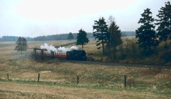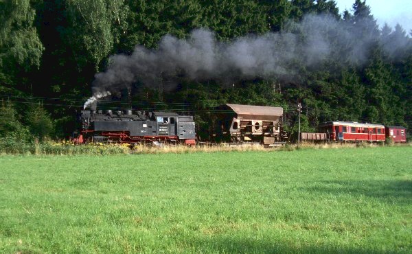 Überführungsfahrt mit Lok 99 7243 und Triebwagen NWE T3 an der Wiese hinter dem Hp Sternhaus Haferfeld am 08.08.1997 (110 Jahre Selketalbahn)