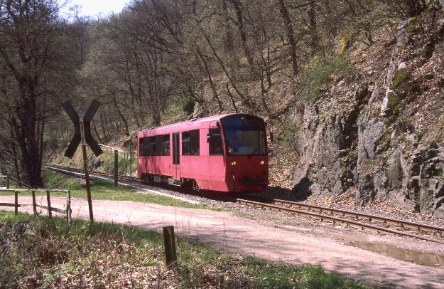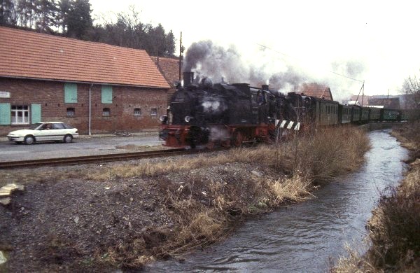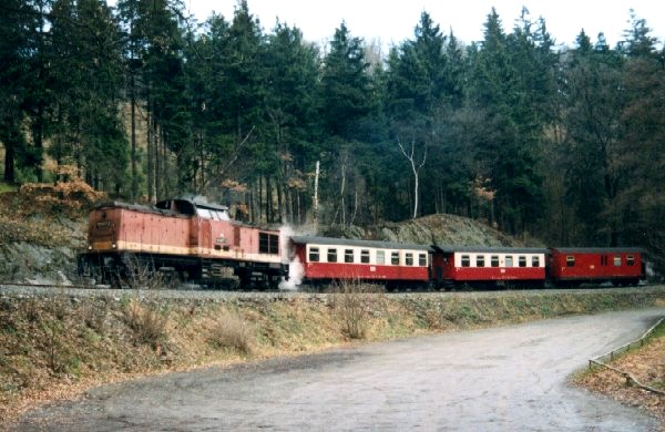 Seltener Einsatz eines "Harzkamels" (Diesellok der BR 199.8) im Selketal - Lok 199 872 mit Personenzug vor dem Hp Drahtzug März 1997