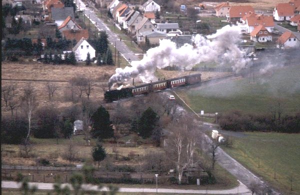 Sonderzug mit den Loks 99 6101 und 99 6102 ("Fiffi") bei der Ortsdurchfahrt Straßberg