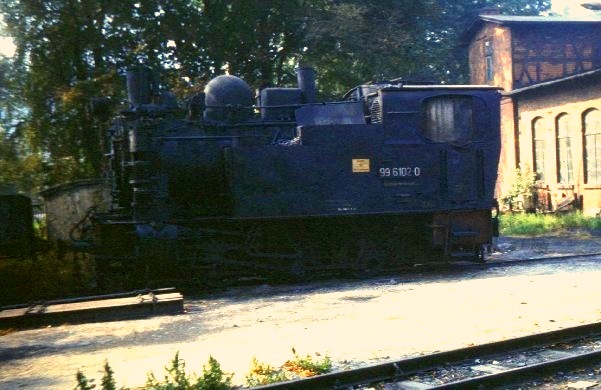 1981 war Lok 99 6102 (Fiffi) am Lokschuppen in Gernrode abgestellt Foto: Klaus Gottschling Vergrößern 80,0 KB |