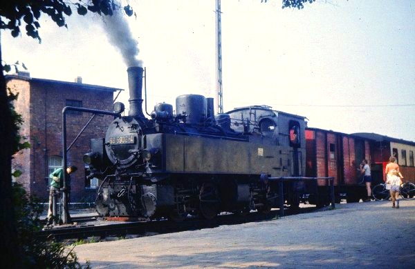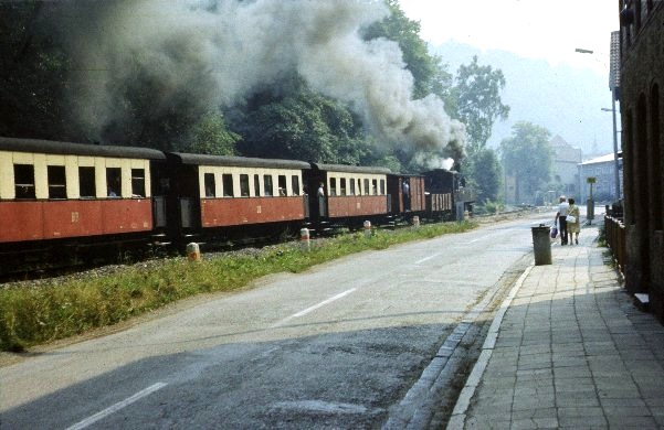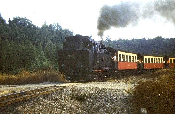 Lok 99 5902 steht im Sommer 1981 vor einem Personenzug in Gernrode. Foto: Klaus Gottschling Vergrößern 85,8 KB |