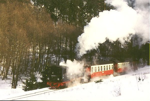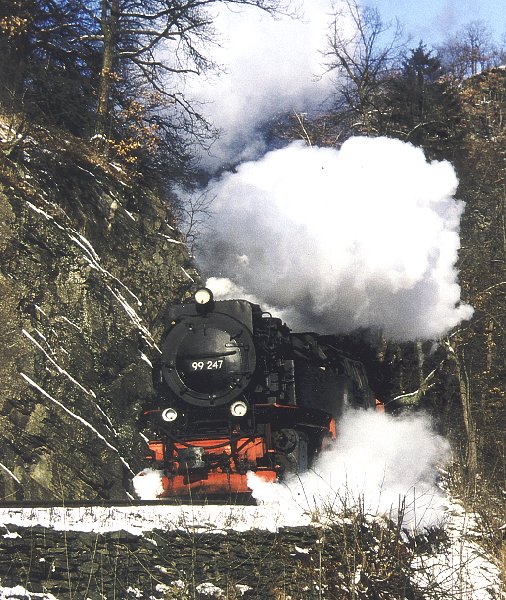 Lok 99 247, damals noch im Einsatz, passiert den Felsdurchbruch zwischen Mägdesprung und Drahtzug.