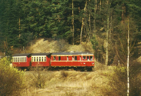 Schlepptriebwagen 187 025 (ehem. NWE T3) mit Personenwagen zwischen Alexisbad und Harzgerode