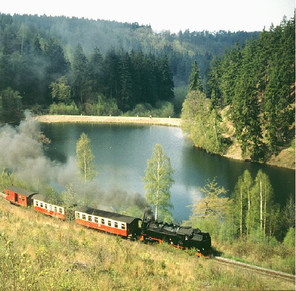 Der nachmittägliche Zug fährt bergauf zum Ramberg am Heiligen Teich vorbei.