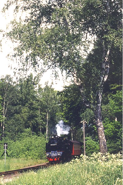 Zug mit Lok 99 6001-4 vor dem Haltepunkt Sternhaus Haferfeld