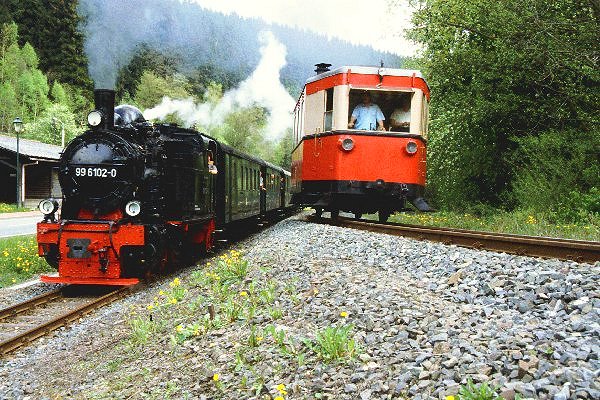 Doppelausfahrt im Bf Alexisbad mit Lok 99 6001 und Triebwagen GHE T1 (187 001) Foto: Heiko Fricke Vergrößern 63,9 KB |
