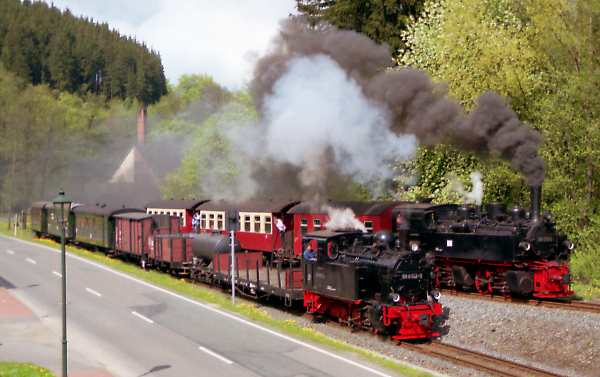 Doppelausfahrt mit dem von 99 7238 gezogenen Planzug Foto: Klaus Gottschling Vergrößern 81,3 KB |
