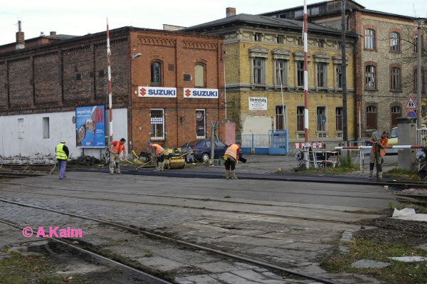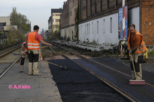 Der Einbau des Schmalspurgleises in den A.-Schweizer-Str. ist nahezu beendet.
