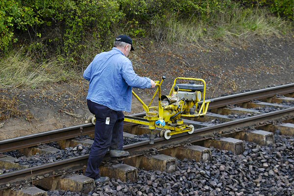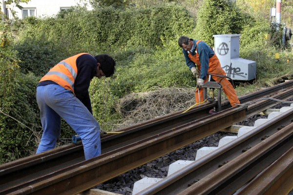 Gleisbauer mit Schraubmaschine beim Abschrauben der Schienenbefestigung (29.09.2005)