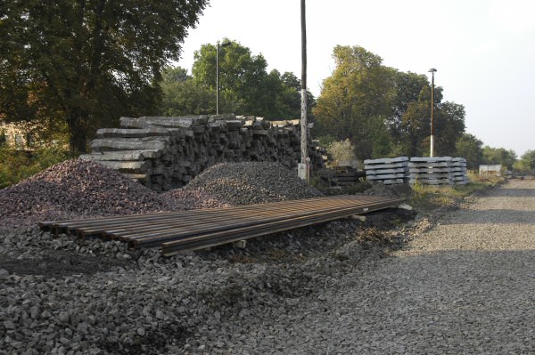 Im Hp Bad Suderode lagern links die verteilten Schmal­spur­schwellen und rechts die ausge­bauten Normal­spur­schwellen.