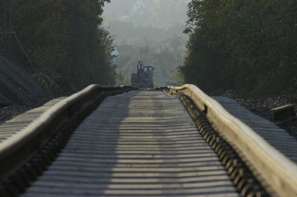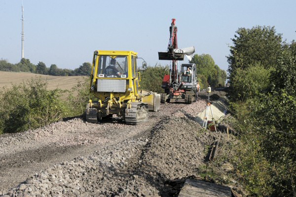 Im Bereich des  Bückeberg wird das Gleisbett zum Verlegen der Schwellen vorbereitet (12.10.2005).