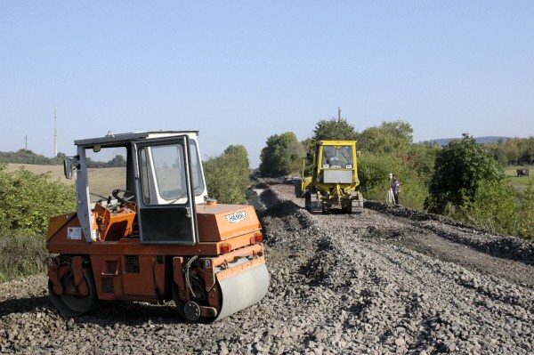 Walze und Planierraupe bei der Herstellung des Gleisbetts