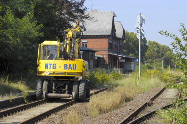 Zweiwegebagger im Gleis 1 des Bf Bad Suderode