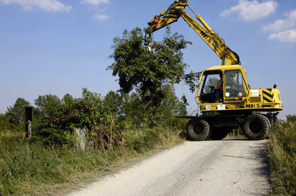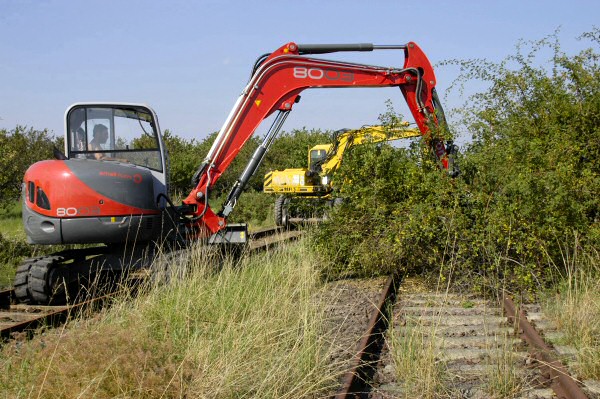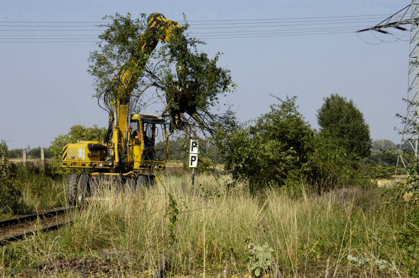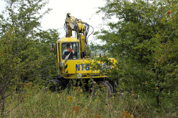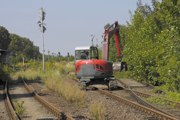 Eine Privatfirma beginnt mit ihrem Bagger im Bereich von Gleis 2 des Bf Bad Suderode mit dem Entfernen des Bewuchses.