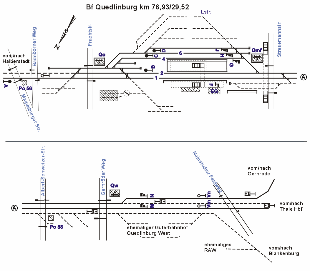 Der Bahnhof Quedlinburg erstreckt sich aus Richtung Halberstadt nordöstlich vor der Magdeburger Straße (Einfahrsignal A) ca. 1,8 km bis in Richtung Thale hinter dem Gernröder Weg (Einfahrsignal M) im Südwesten (siehe Stadtplan / Wohnungswirtschaftsgesellschaft mbH Quedlinburg).