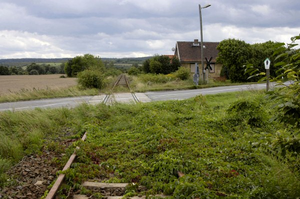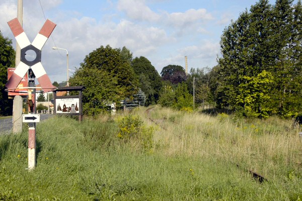Vom Fotostandort bei km 22,1 in der südöstlichen Einfahrt (von Gernrode) des Bf Bad Suderode aus ist der BÜ in der Bahnhofseinfahrt kaum noch erkennbar.