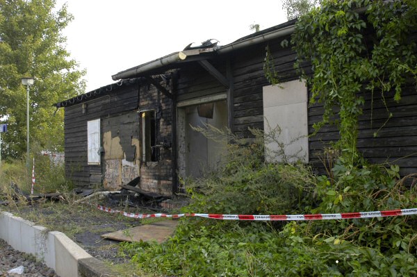 hinterer Teil des Wartehäuschens vom Hp Quedlinburg-Quarmbeck am 02.09.2005 nach Beschädigung durch Brandstiftung wenige Tage zuvor