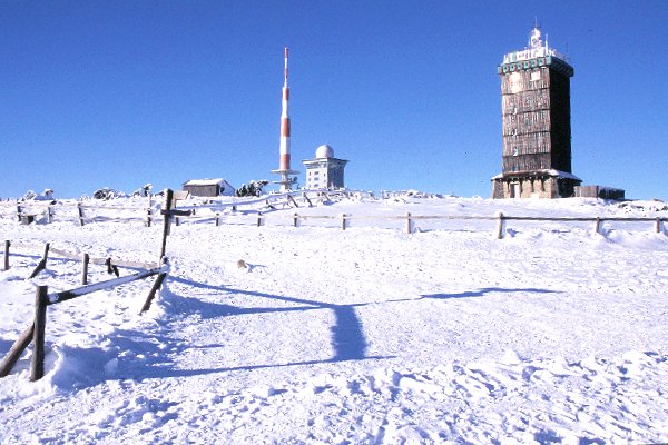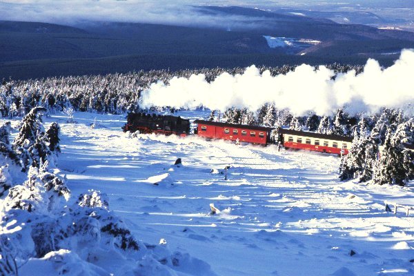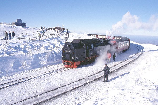 Wieder ist ein Wochenende vergangen, an dem die Gegensätze in der Natur nicht größer sein konnten. Beide Tage hieß es mit Lok 99 7238 und sechs Personenwagen auf zum Vater Brocken. Der hüllte sich am Sonnabend in Nebelschwaden. Kaum mehr als 20m Sicht erforderten auch von kundigen Brockenbesuchern ein gutes Orientierungsvermögen. Die hohe Luftfeuchtigkeit führte in dieser Gipfellage zu Rauhreif und damit zu beeindruckenden Eisgebilden an Bäumen und Felsen. Anders sah es dagegen am Sonntag aus. Während in Drei Annen Hohne noch alles vom Nebel eingehüllt war lockte strahlender Sonnenschein mit Aussicht auf eine geteilte Landschaft. Das nördliche Harzvorland zog die Blicke der Besucher auf sich. Über den Höhenzügen des Harzes brodelten jedoch Wolken, aus denen nur die Bergkuppen über 800m herausragten Ab dem Sender Torfhaus war dann der Übergang zur freien Sicht in das Harzvorland wieder vollzogen. Der hohe Schnee machte aus den sonst eingezäunten Wegen ein fast frei zugängliches Gelände. Nur die Wegweiser und die zahlreich vorhandenen Fußspuren kündeten vom rechten Weg. Bei milden Temperaturen von knapp über Null Grad war der Aufenthalt für alle eine erholsame Angelegenheit.