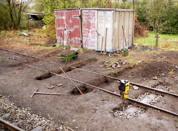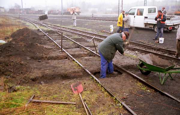 Unter fachlicher Anleitung des Streckenmeisters der HSB wurden insgesamt neun Stahlschwellen eingezogen und mit maschineller Hilfe unterschottert sowie gestopft. Die dazu notwendigen Schachtarbeiten bestätigten allen Teilnehmern die dringende Notwendigkeit dieser Arbeit. So wurden zwar zahlreiche Auflageplatten mit Schwellenschrauben und Kleineisen gefunden, die zugehörigen Holzschwellen jedoch nicht.