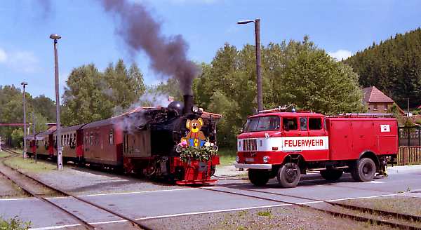 Die Rückfahrt am Nachmittag wurde natürlich für Doppelausfahrten in Alexisbad genutzt. Hier kam es zur Begegnung mit dem historischen Triebwagen 187 025 (NWE T3).