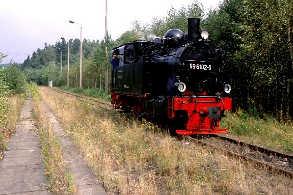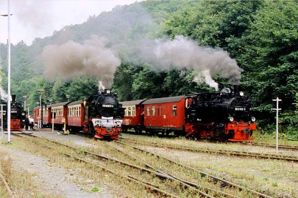 Auf dem Rückweg nach Gernrode wurde nicht versäumt, in Alexisbad die Doppelausfahrt zu arrangieren. Die Darsteller diesmal: 99 6102 und Lok 99 6001. Gemeinsam mit der Lok 99 5906 vom Planzug von und nach Gernrode waren zeitweilig alle derzeit betriebsfähigen Dampfloks der Einsatzstelle Gernrode im Bahnhof Alexisbad versammelt.