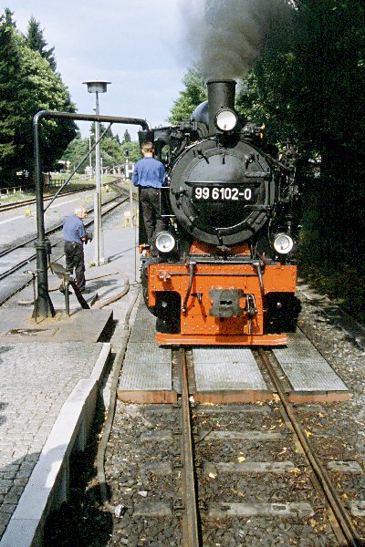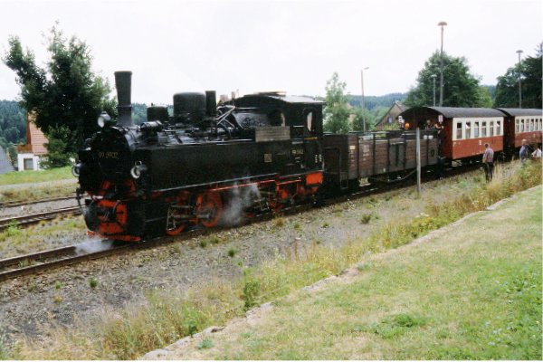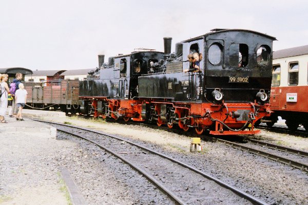 Trotz des halbleeren und um einen Wagen gekürzten Zuges stand in Silberhütte wieder Mallet-Lok 99 5906 für den Vorspanndienst bereit.