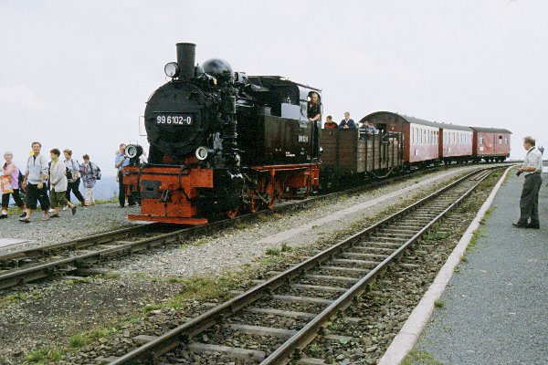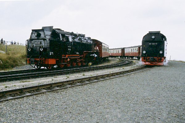 Nach Einfahrt in den Bahnhof Brocken waren alle Gleise besetzt. Auf Gleis 1 (Hausbahnsteig) stand der Planzug 8920/8922. Gleis 2 war vom Sonderzug der HSB (Loks 99 5901, Lok 99 5902, "Schienen-Cabrio" und Traditionswagen) besetzt. Sonderzug 89420 stand auf Gleis 3. Vorspannlok 99 6101 setzte sich als Schlußlok hinter die Traditionswagen. Damit Lok 99 7241 vom Zug 8922 umsetzen konnte, mußte der HSB-Sonderzug kurzzeitig das Gleis 2 freimachen.