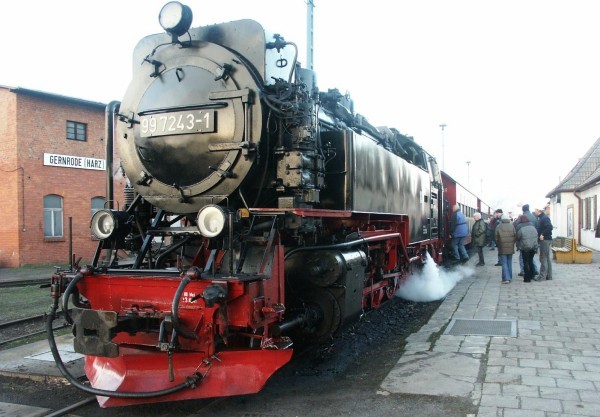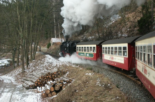 Am Sonnabendfrüh half die für den Planzug bereitstehende Lok 99 7235 beim Zusammenrangieren des Sonderzuges, welcher pünktlich das schneefreie Gernrode verließ.