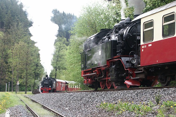 Auf seiner Fahrt begegnete der "Fiffi" mehmals einem anderen Sonderzug. Für einen dänischen Eisenbahnclub war ein HSB-Sonderzug (als PmG) mit Malletlok 99 5902 auf der Selketalbahn unterwegs.