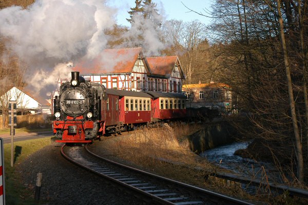 Weiter ging es nach der Mittagspause zum Endpunkt der Sonderfahrt dem Bf Straßberg. Natürlich fanden auch hier wieder Fotohalte statt. Als Erinnerung an die Bedienung des Anschlusses Fluor am Streckenkilometer 22,66 fuhr "Fiffi" mit den zwei offenen Güterwagen vom Bahnhof Straßberg aus auf die Strecke. Im Anschluß an die Kreuzung mit dem Triebwagen 187 016 nach Nordhausen startete der Sonderzug nach Alexisbad. Dort wartete die 99 6001 mit dem Planzug nach Harzgerode zur ersten Dampfzugdoppelausfahrt des Jahres 2005. Zur Erinnerung: Täglich gibt es im aktuellen Winterfahrplan um 08:32 Uhr eine Doppelausfahrt zweier Triebwagen. Obwohl das Tageslicht immer mehr der Dämmerung wich, hieß es auf dem Rückweg am Ramberg ein letztes Mal aussteigen zum Fotohalt. Die Anfahrt des Zuges in der Ramberg-Steigung war ein nicht zu verachtendes Hörerlebnis. Das Lokpersonal stellte dabei sein Können unter Beweis. Trotz nasser Schienen kam die Lok nicht zum Schleudern.