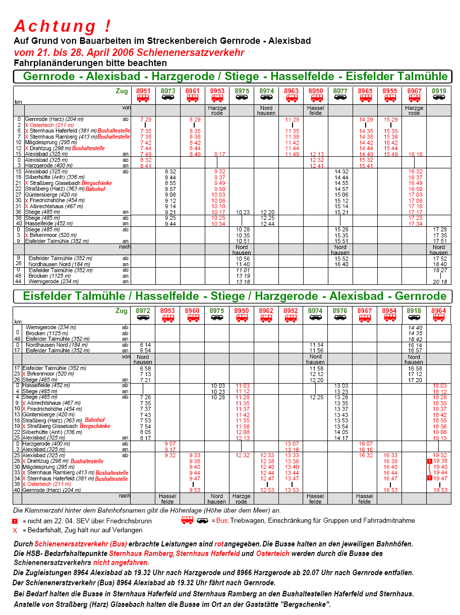 Auf der Selketalbahn finden zwischen Alexisbad und Sternhaus Ramberg derzeit Arbeiten zur Instandsetzung des Oberbaus statt. Während es zunächst keine Zugausfälle gibt, da die Arbeiten in der nächtlichen Betriebsruhe erfolgen, wird es vom 21. bis 28. April 2006 zu Fahrplaneinschränkungen kommen. Alle von der Einsatzstelle Gernrode erbrachten Zugleistungen werden durch Busse im Schienenersatzverkehr (SEV) gefahren. Es fahren auf der Selketalbahn nur die Triebwagen von/nach Nordhausen (Zug 8918/8919, 8972 8977). Der als Ersatz für Zug 8964 fahrende Bus von Hasselfelde wird nicht nach Harzgerode sondern gleich von Alexisbad nach Gernrode fahren. Die Busse des SEV halten nicht am Haltepunkt Osterteich, Haltepunkt Sternhaus Haferfeld, Bahnhof Sternhaus Ramberg, Haltepunkt Drahtzug sowie Haltepunkt Straßberg-Glasebach. Dafür halten die SEV-Busse bei Bedarf an den Haltestellen der Q-Bus GmbH Haferfeld, Sternhaus, Drahtzug und Bergschänke Straßberg.