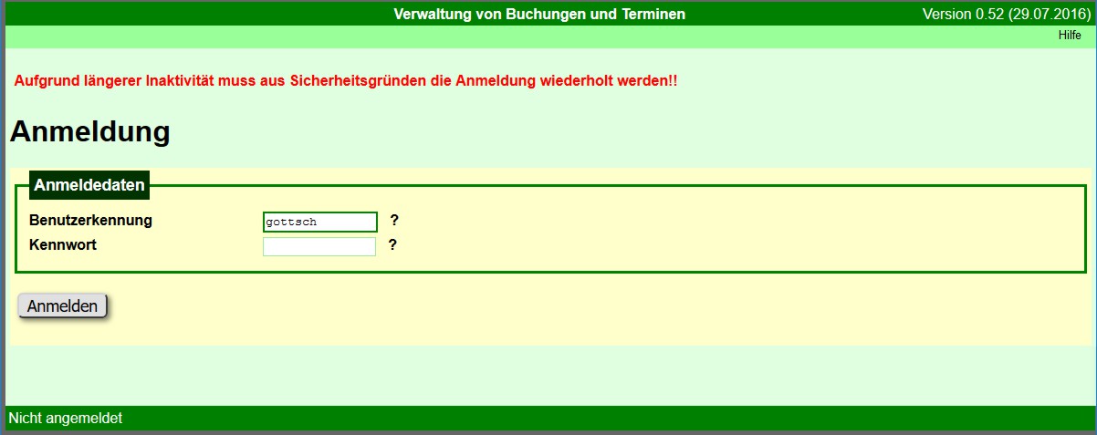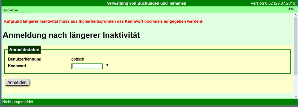 War ein angemeldeter Benutzer lange Zeit inaktiv, dann erfolgt beim Aufruf eines Menüpunktes bzw. Absenden eines Formulars das Abmelden des Benutzers. Es wird das Anmeldeformular mit einem Hinweis angezeigt