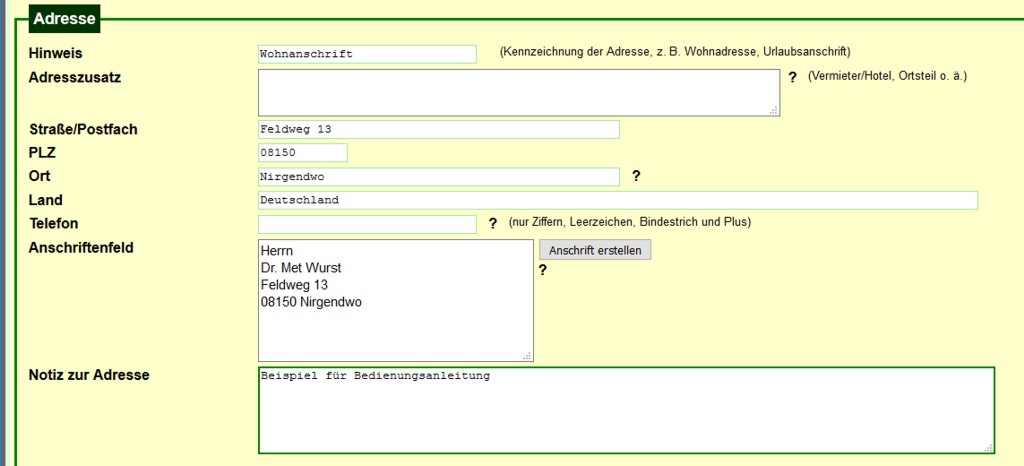 Im Feld „Adresszusatz“ sind bei Bedarf Ergänzungen zur Adresse einzutragen. Das kann z. B. bei Urlaubsadressen der Name des Vermieters („bei Familie Müller“) sein. In dem Feld können Angaben zum Gebäude (z. B. bei Adressen in den Niederlanden) eingetragen werden.