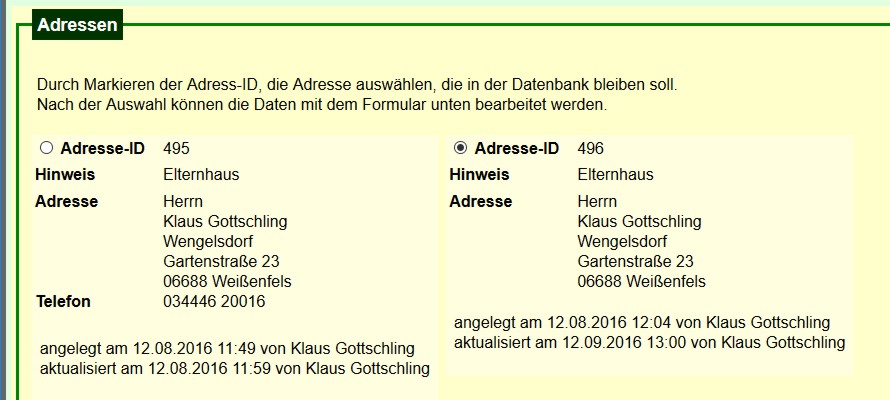 Durch Setzen des Auswahlknopfes entscheidet man, welcher Datensatz erhalten bleibt und welche Adressdaten in das Formular unten übernommen werden.