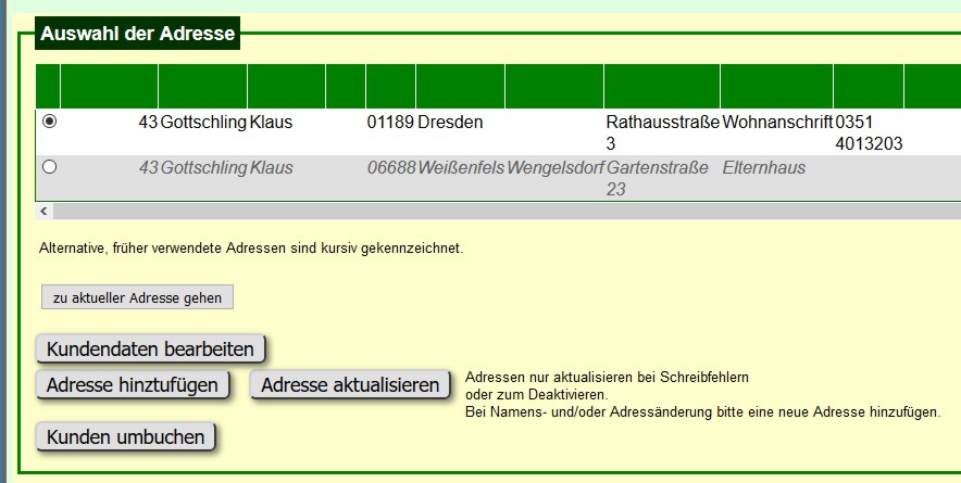Möchte man in einer Buchung die Adresse des Kunden ändern, dann kann man dass durch Setzen des Auswahlknopfes in der Liste der Adressen (s. Bild 1).
