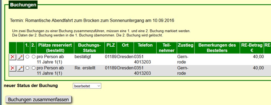 Hat man einen Buchungsstatus mit Platzreservierun (z. B. „bearbeitet“) gewählt, ordnet das Portal bereits reservierte Plätze (Fahrkarten) der 1. Buchung zu. Hatte eine der beiden Buchungen einen Buchungsstatus ohne Reservierung, fügt das Portal die erforderliche Anzahl Fahrkarten hinzu.