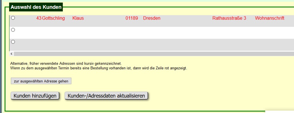 Die Auswahl einer Adresse aus der Liste erfolgt durch Anklicken des Auswahlknopfes links vor der Adresse.