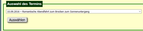 Hat man einen anderen Termin gewählt oder den Schalter betätigt, wird die Seite neu angezeigt, um die Preise/Texte der Positionen und die Stationen für Zu-/Ausstieg entsprechend der gewählten Veranstaltung aus der Datenbank einzulesen.