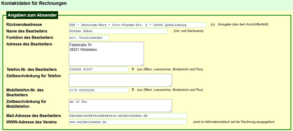 Der obere Teil des Formulars zum Bearbeiten der Kontaktdaten enthält im oberen Teil Angaben zum Absender (s. Bild 1), die Bestand­teil des Kopfbereichs der Rechnungen sind (siehe Rechnungsmuster).