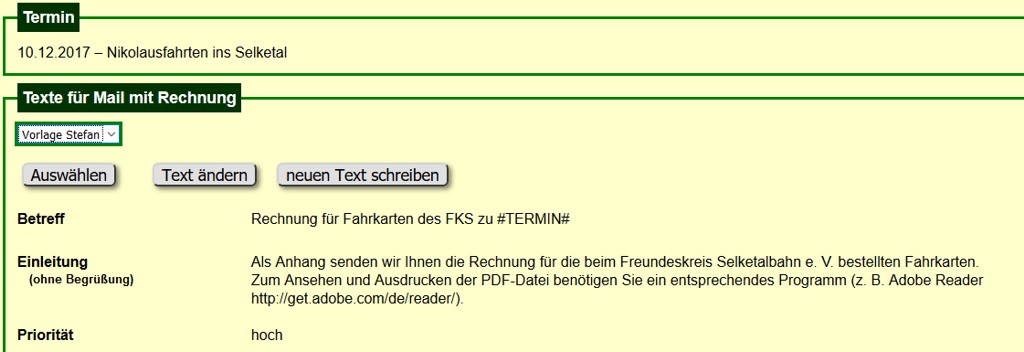 Unter dem Veranstaltungstermin befinden sich ein Auswahlfeld und drei Schalter zum Auswählen und Bearbeiten der Texte für die E-Mails (s. Bild 2).