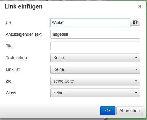 Nach Klick auf den Schalter wird ein Dialogfenster geöffnet, in welchem man den Namen einer Textmarke/eines Ankers angeben kann.