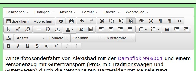 Beim Bearbeiten von Beschreibungen zu Veranstaltungen werden nach Betätigen des Schalters „Speichern“ Änderungen noch nicht gespeichert sondern nur in das Formular zur Veranstaltung übernommen. Man muss im Formular der Veranstaltung den Schalter betätigen.