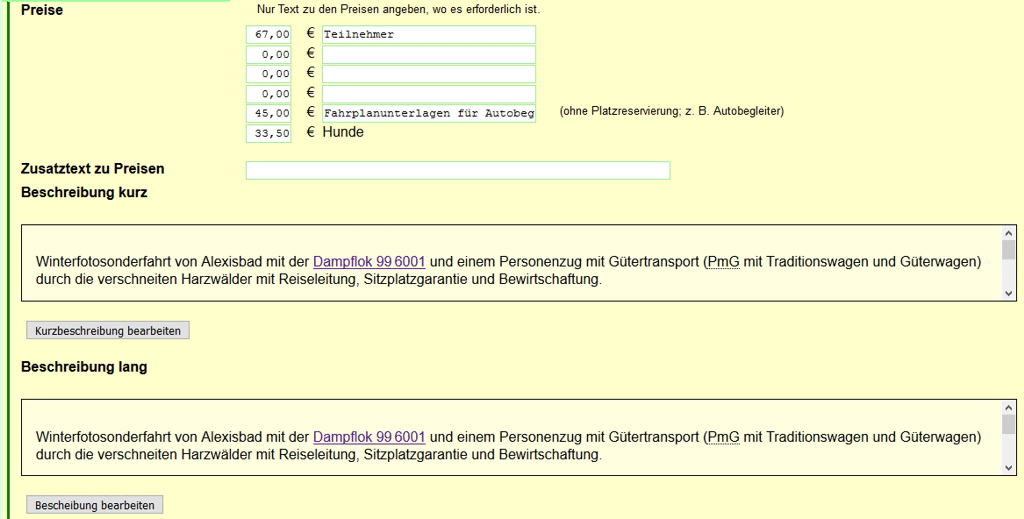 Bei Veranstaltungen mit Vorverkauf gibt es fünf Preiskategorien. Zu jedem Preis > 0 € muss ein Text eingegeben werden.