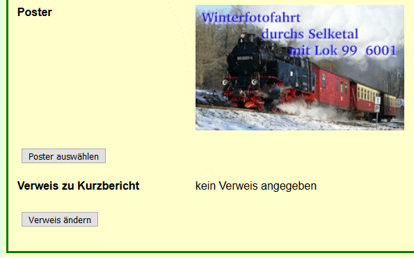Aus dem im Poster-Verzeichnis abgelegten Bildern (Poster verwalten) kann nach Klick auf den Schalter „Poster auswählen“ ein Bild ausgewählt werden. Das Bild wird im Verkaufsportal und zu gegebener Zeit auf der Startseite des Vereins angezeigt.