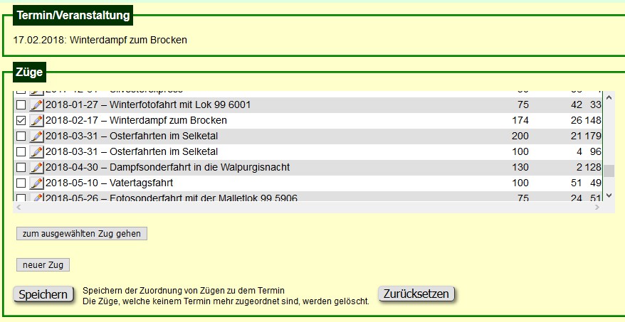 Durch Setzen des Hakens im Kontrollkästchen wählt man den jeweiligen Zug für den Veranstaltungstermin aus.